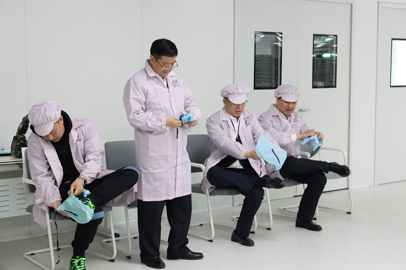 因生产线作业要求严格,进入生产线须按要求着装静电服,佩戴静电帽,穿戴静电鞋套。在倪斌先生的演示下,各位领导们有序完成进入生产线前的准备工作。